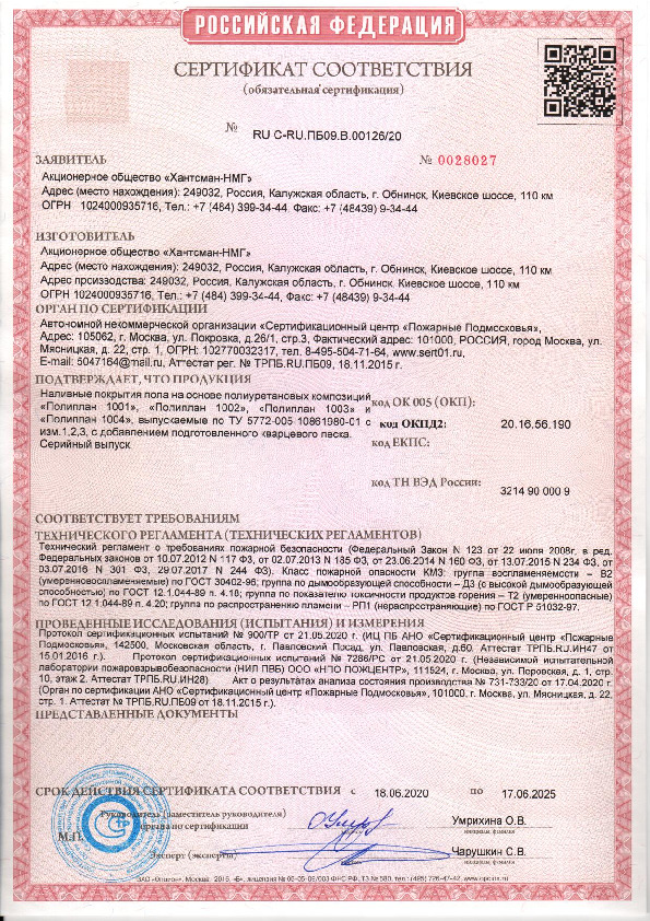 Самовыравнивающаяся полиуретановая композиция. Колеруется по карте цветов Huntsman. Защищает основание от воздействия водных и химических растворов, повышает эстетическую привлекательность.